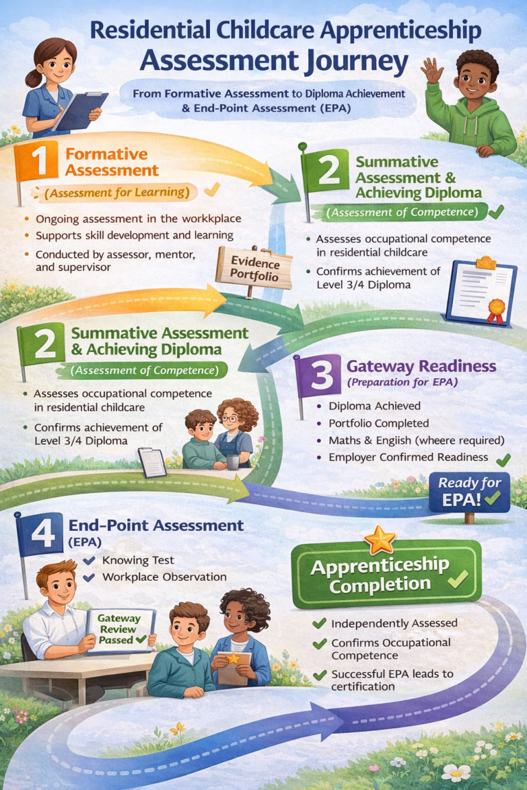 The Adult/Residential Care Apprenticeship Assessment Journey is designed to be inclusive, learner centred, and accessible at every stage. The journey ensures that all learners—regardless of background, learning needs, or starting point – can progress confidently through the apprenticeship, develop competence, and achieve their qualification.