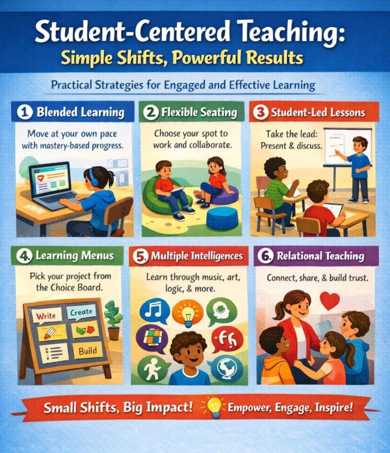 Student‑centred learning places the learner at the heart of the educational process. Instead of the teacher controlling all decisions, the student becomes an active participant who helps shape the pace, style, and direction of learning. The goal is to increase engagement, ownership, confidence, and independence. The image presents six key